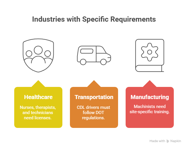 - Transportation & Logistics: CDL drivers face Department of Transportation regulations, drug testing requirements, and logbook compliance. Quick mobilization requires streamlined credentialing.
