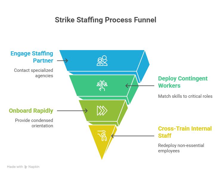 • Engage a Strike Staffing Partner: Pre-arranged staffing agencies with specialized labor pools can mobilize workers nationwide.