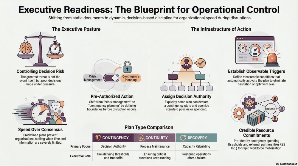 Unlike tactical response plans owned by individual teams, executive contingency planning establishes organizational posture. It determines who decides, what takes priority, and which tradeoffs are acceptable when time and information are limited. Without this clarity, even capable organizations stall when disruption demands speed.