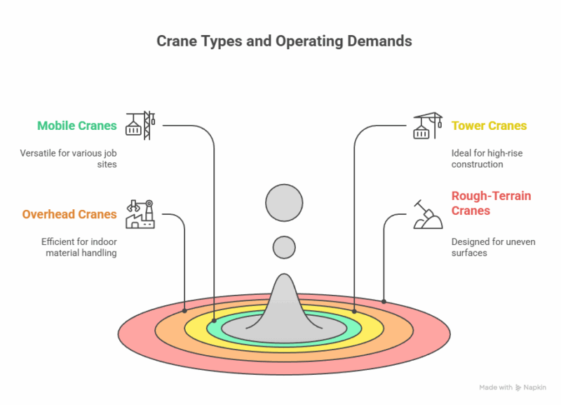 An operator trained on mobile cranes may not be prepared for tower crane work involving greater height, longer radii, and complex visibility challenges. Similarly, overhead crane operators require familiarity with indoor industrial environments rather than outdoor construction dynamics.