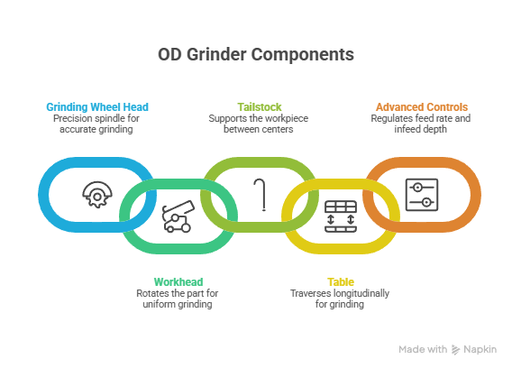 An OD grinder is a cylindrical grinding machine designed to remove material from the external surface of a rotating workpiece to achieve tight dimensional tolerances and refined surface finishes. The process relies on a rotating abrasive wheel that gradually removes microscopic layers of material while the workpiece turns between centers or in a chuck.