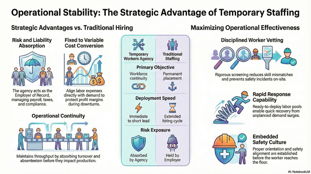 A temporary workers agency functions as a risk-management tool for labor-intensive operations. Workforce flexibility reduces exposure to forecast errors, seasonal spikes, absenteeism, and unplanned demand surges.